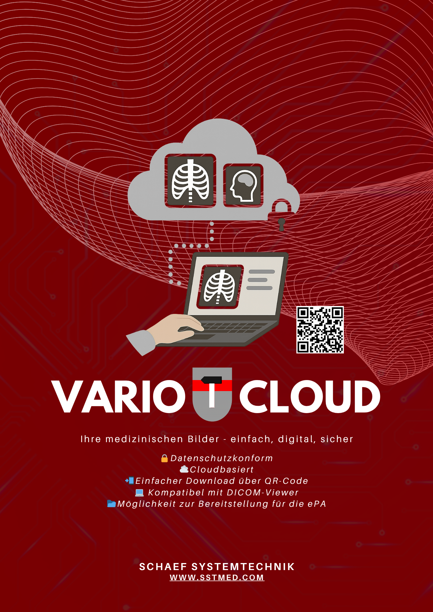 Mit Vario Cloud können Sie die Bilder eines Patienten auf unseren Cloud-Server übertragen. Der Patient kann sie dann von dort herunterladen. Um dem Datenschutz Rechnung zu tragen, erhält der Patient bereits in der Praxis einen Papierausdruck mit Link und QR-Code. So funktioniert das Ganze sicher und einfach.